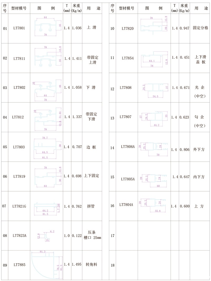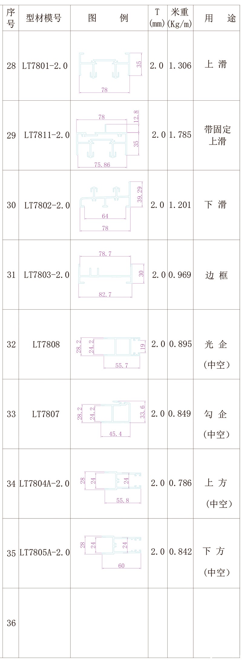 1.本系列装中空玻璃时,上下方料与光勾企料的槽口不一致,安装时注意选用合适的密封胶条;3.型材表中米重仅为型材理论重量,因型材表面处理及包装方式不同,会对型材的实际重量产生差异。