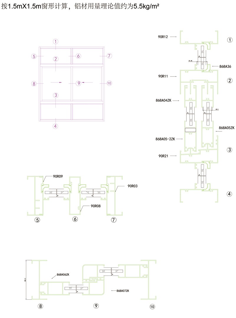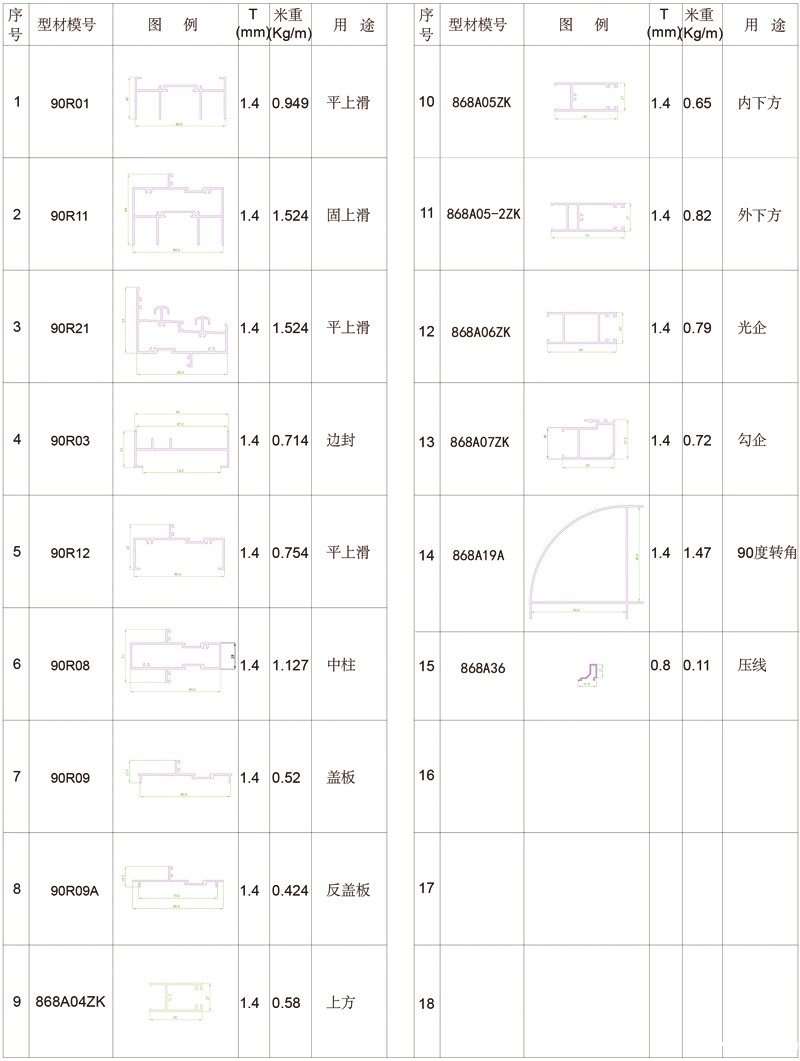 1.90R推拉门窗框、扇形材线条柔和,外形美观;3.型材表中米重仅为型材理论重量,因型材表面处理及包装方式不同,会对型材的实际重量产生差异。